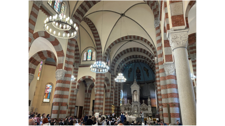 式は、ミラノの教会で行われました。Cresimaに参加する子どもたちは40-50人ぐらい…? お祝いに駆けつけたのは、それぞれに10-15人ぐらいだとすると、500-700人ぐらいでしょうか。その場には、ものすごい祝福のエネルギーがあり、そこにいるだけで、エネルギーをもらえるような感じがしました。